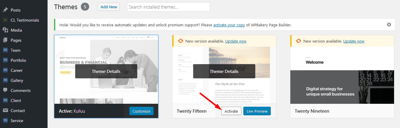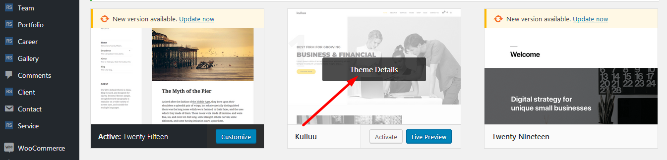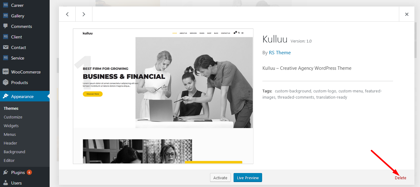 • Step 1: You need to deactivate the current kulluu theme in Appearance > Themes section by simply activating a different theme. Once you activate a different theme, you can delete the kulluu.