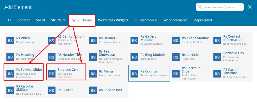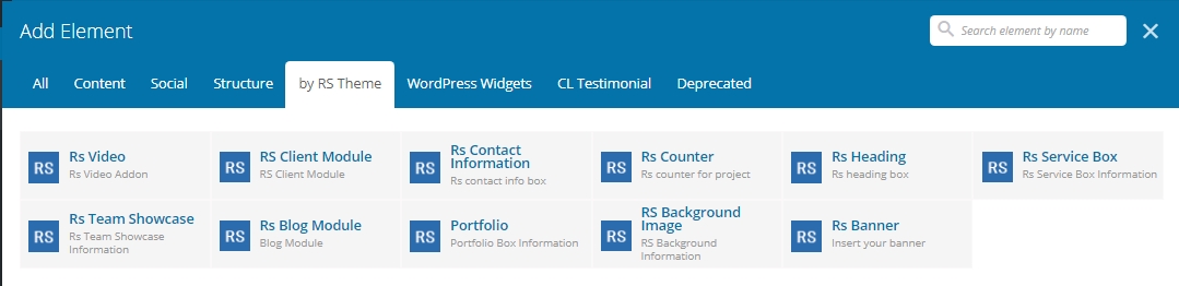 Our RS Theme Addons plugin gives you instant access to built in content elements. Our Elments we developed based of our theme.