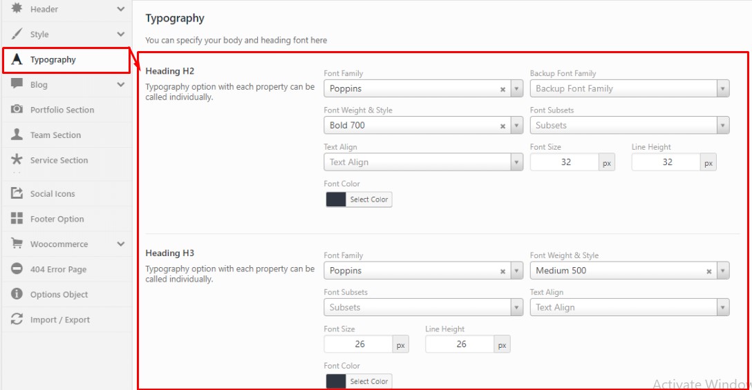 Headings font settings - Font Family (Google fonts), Font Weight & Style, Text Align, Font Size, Line Height, Font Color