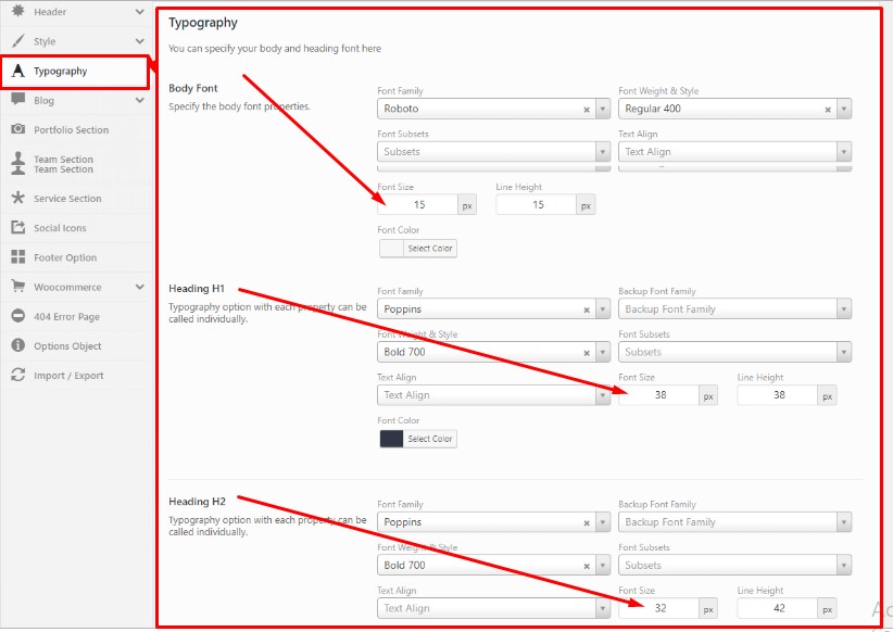 Body font settings - Font Family (Google fonts), Font Weight & Style, Text Align, Font Size, Line Height, Font Color